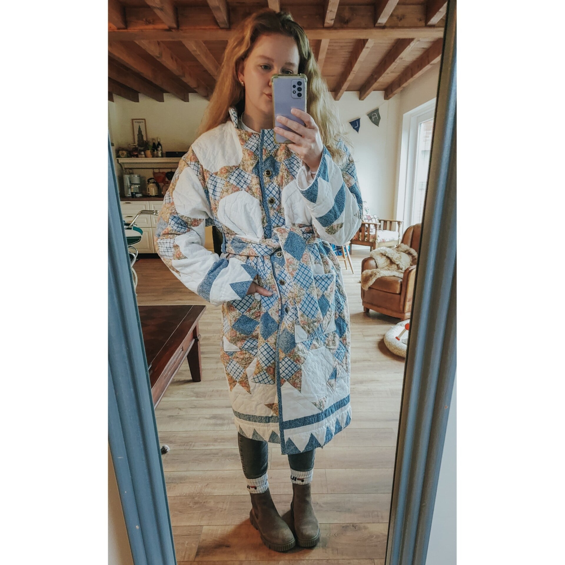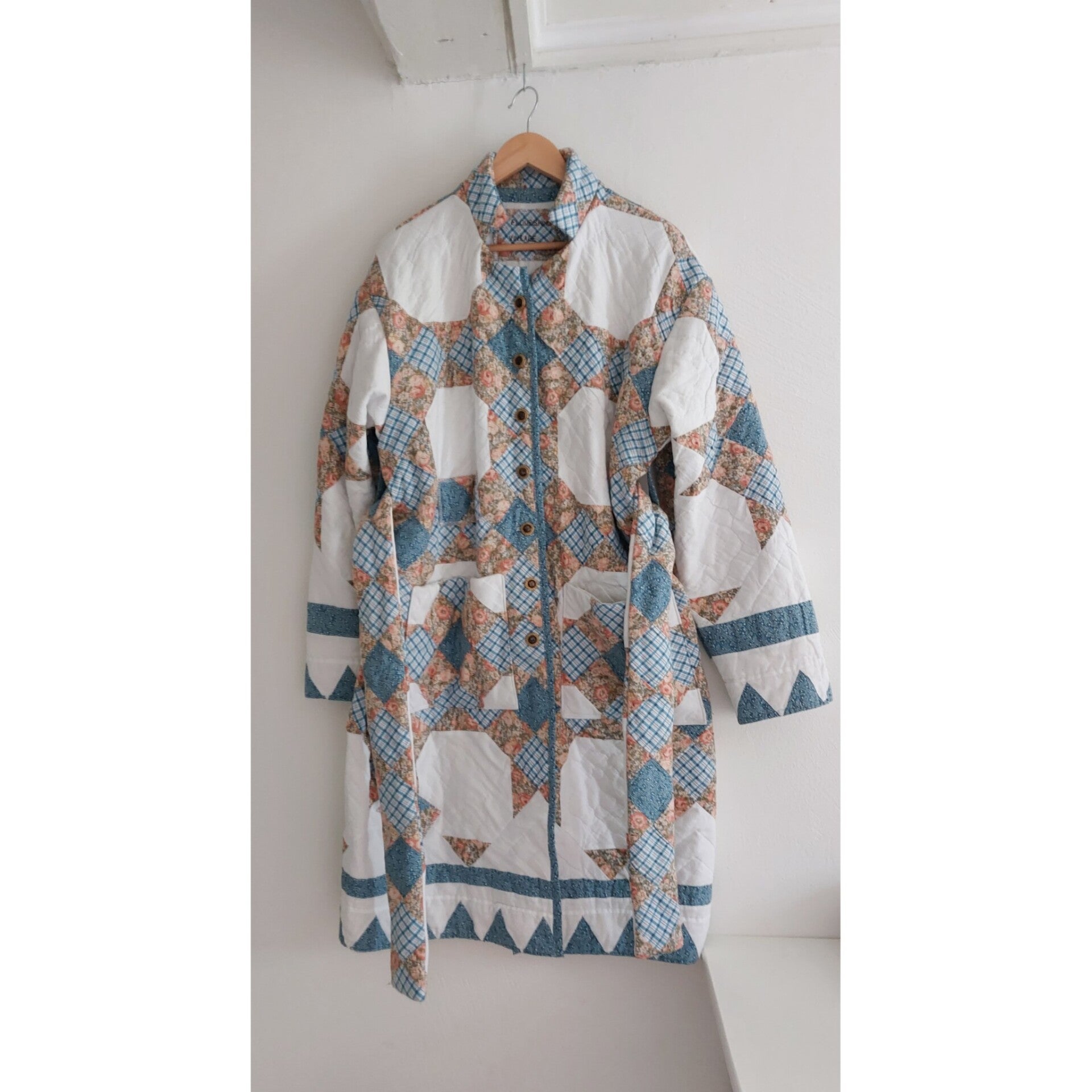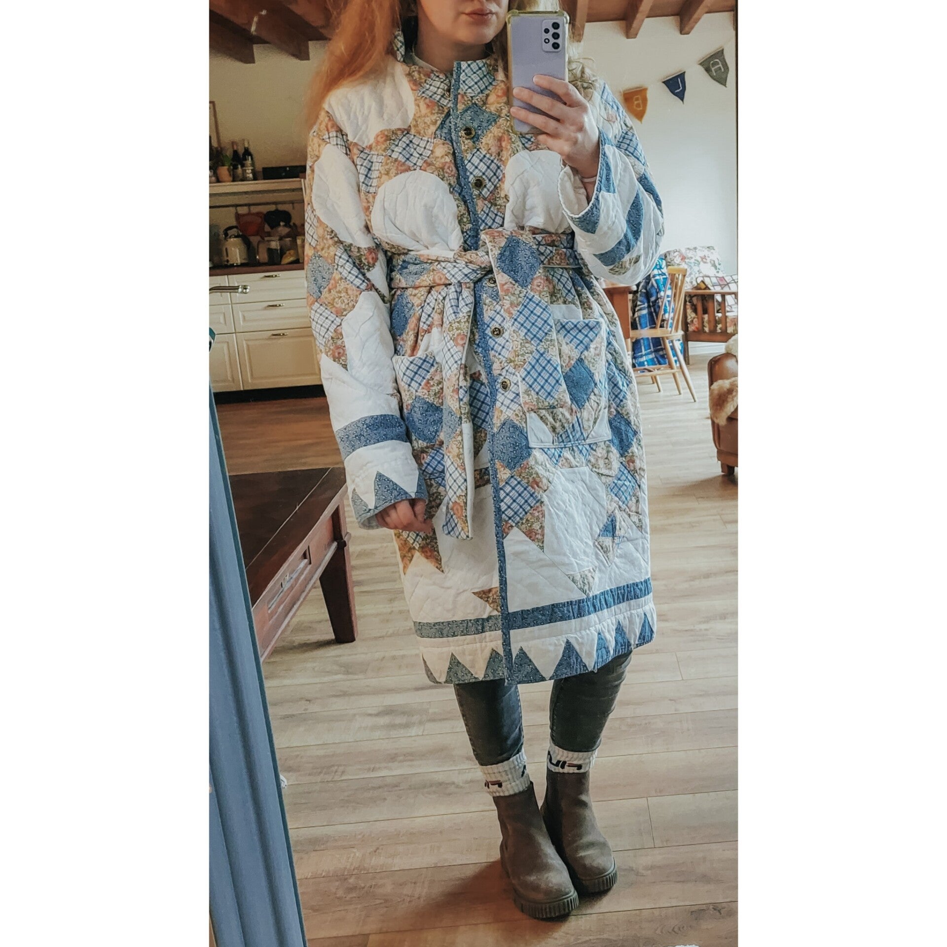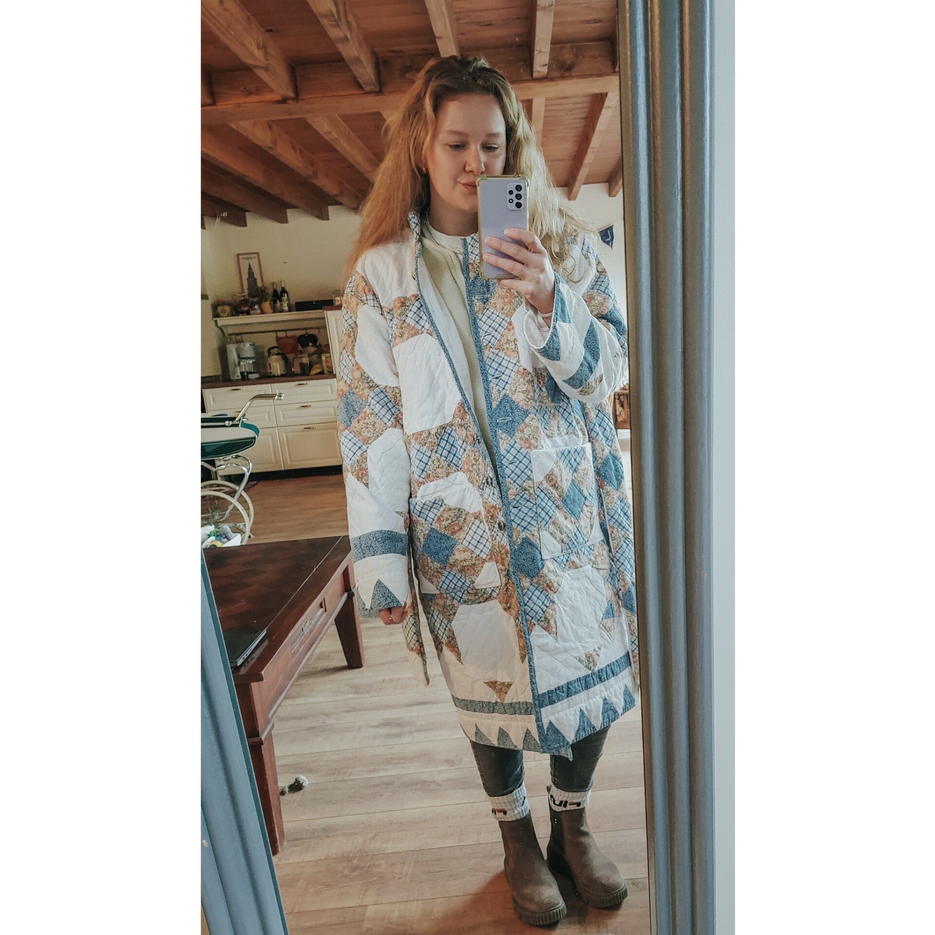 Unique patchwork coat, made out of a vintage quilt blanket. The coat has 2 pockets and closes with 7 vintage buttons and a matching belt. It is a lovely piece to use as an in-between coat. The model is designed to wear a bit oversized.