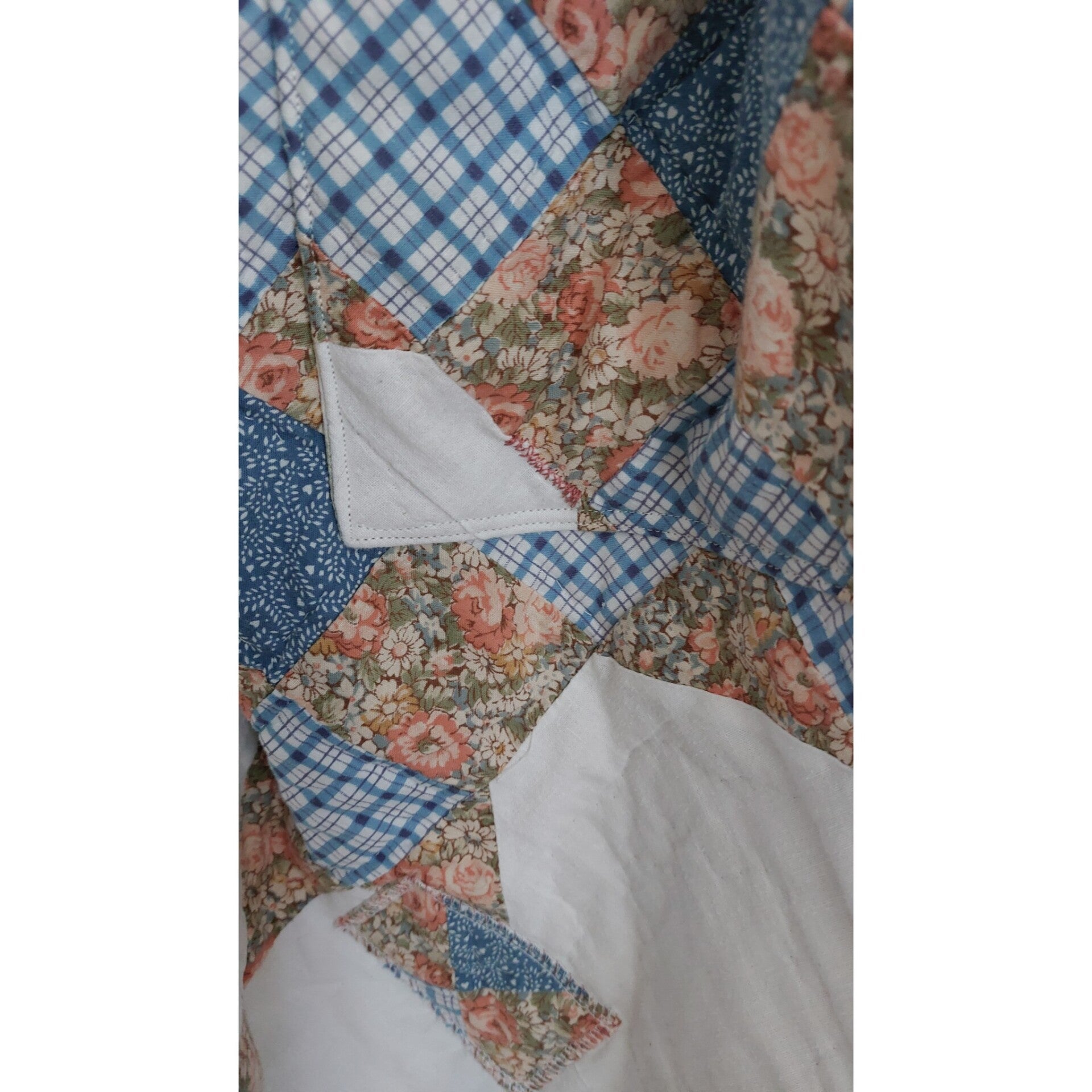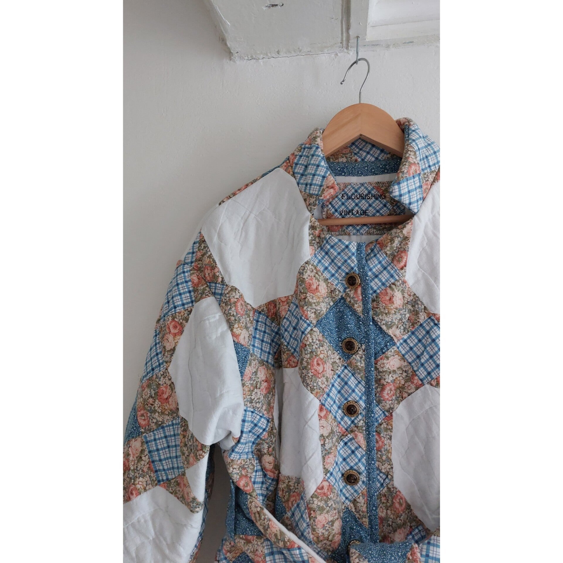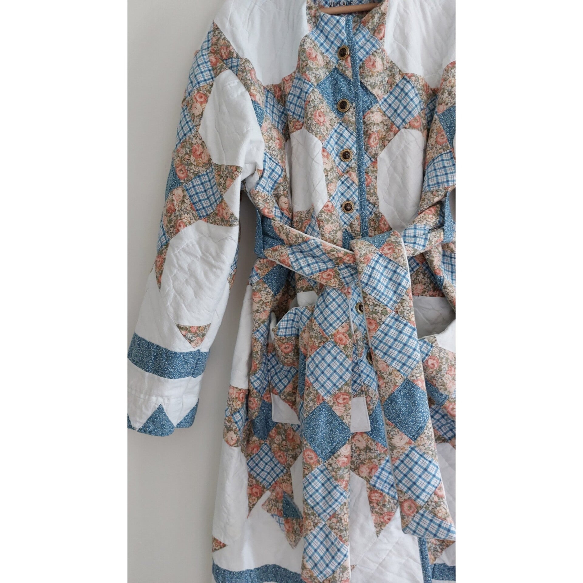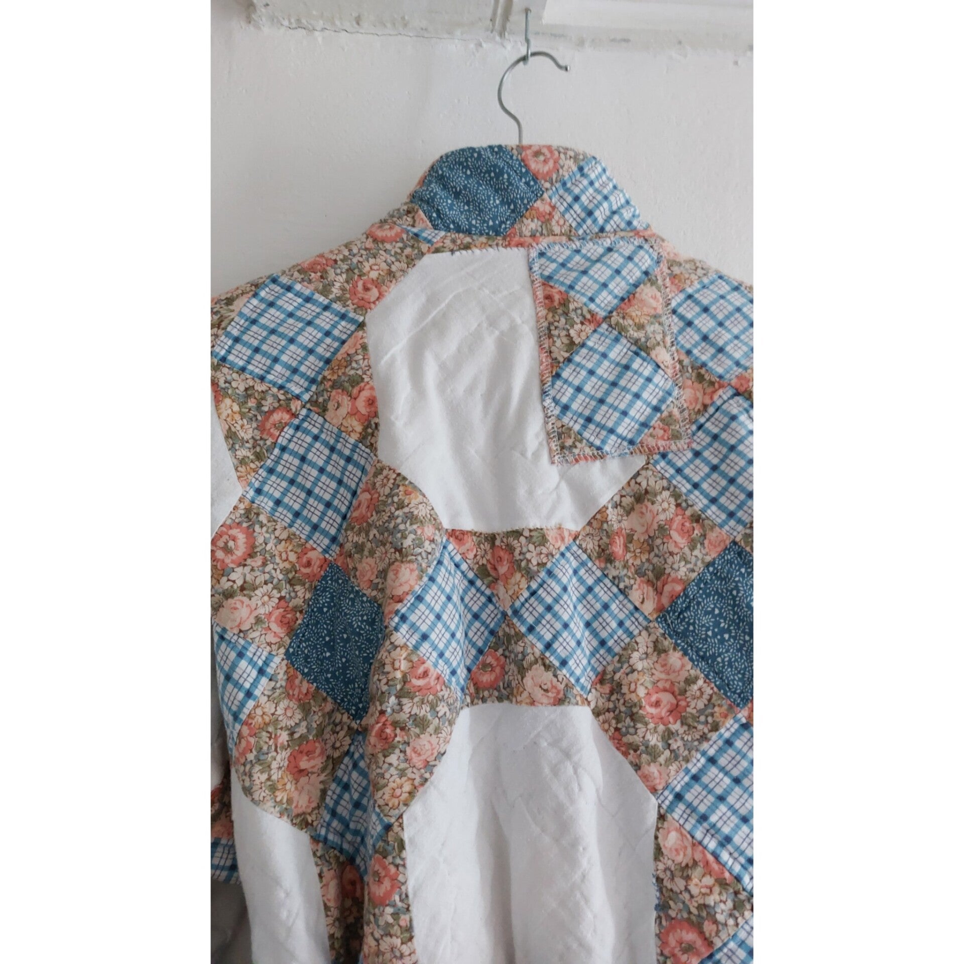 Unique patchwork coat, made out of a vintage quilt blanket. The coat has 2 pockets and closes with 7 vintage buttons and a matching belt. It is a lovely piece to use as an in-between coat. The model is designed to wear a bit oversized.