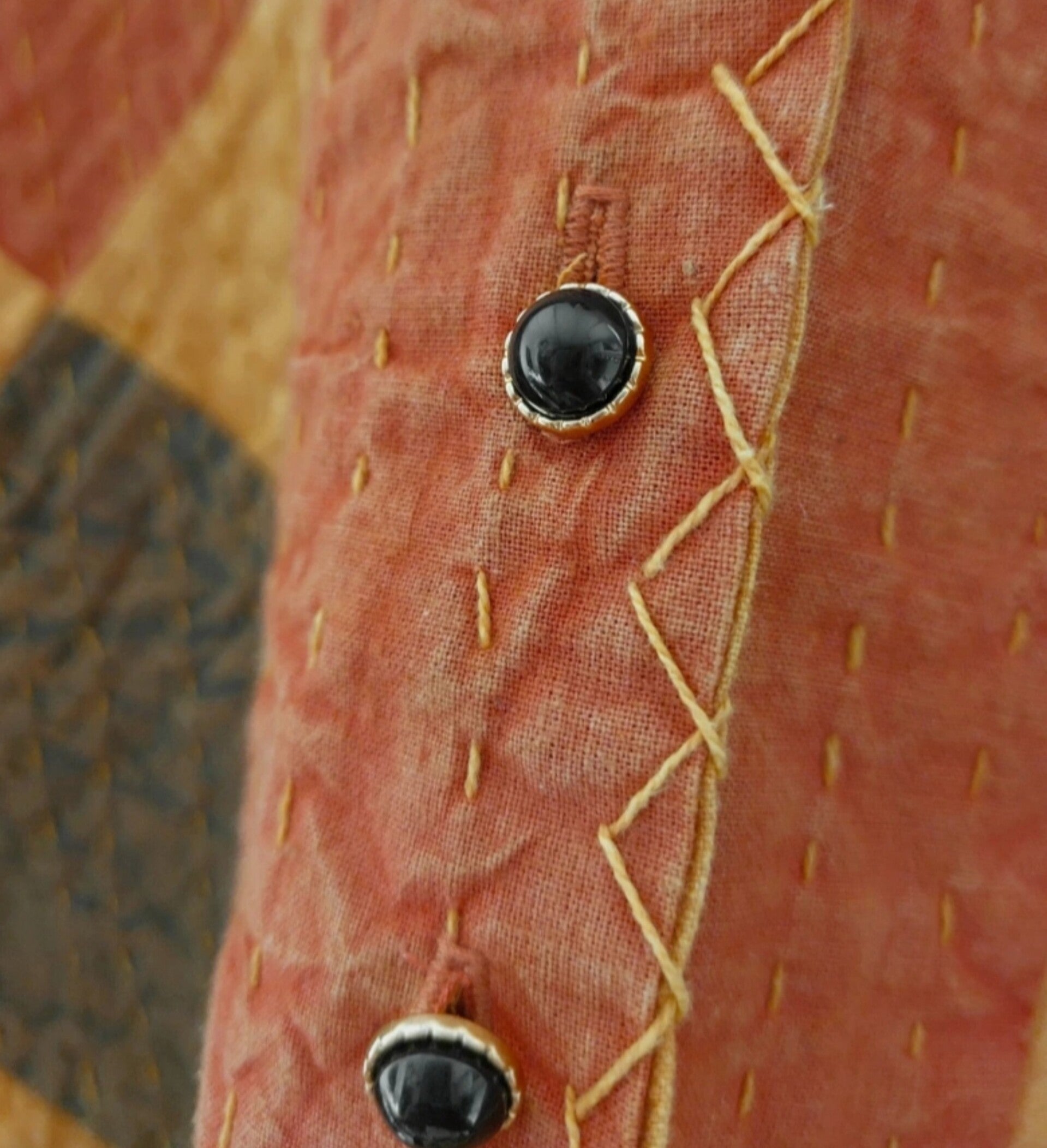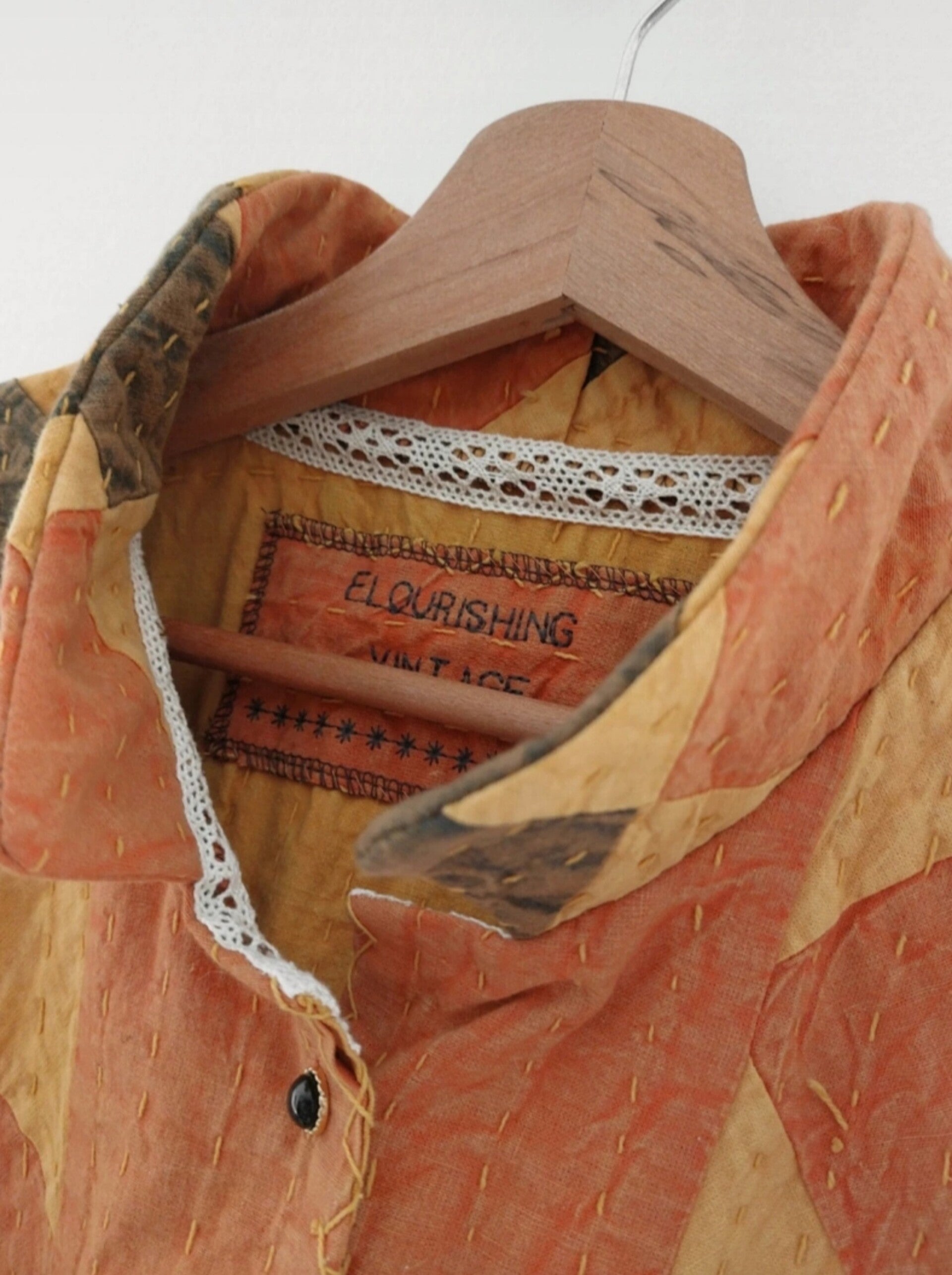 Unique patchwork quilt coat, with ethnic patterns. The coat is (hand)made from a vintage Indian quilt blanket. It has 2 large pockets and closes with 10 small vintage buttons.