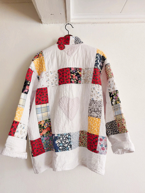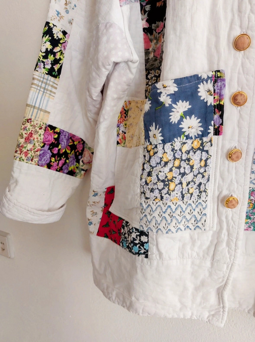 Unique patchwork coat, made out of a vintage quilt blanket. The coat has 2 pockets and closes with 7 vintage buttons. It is a lovely piece to use as an in-between coat. The model is designed to wear a bit oversized.