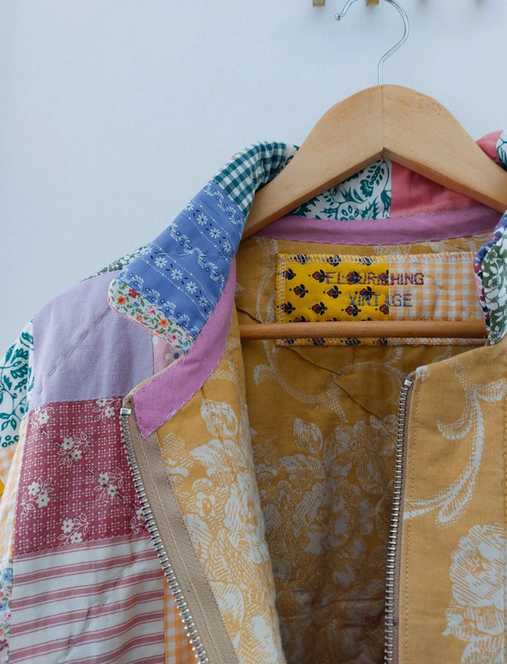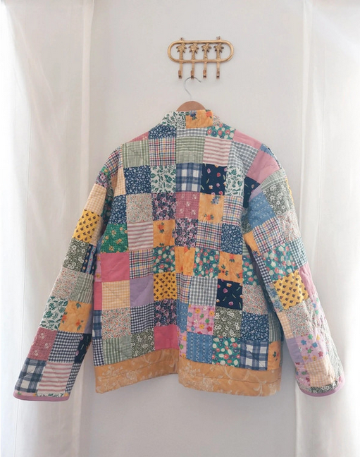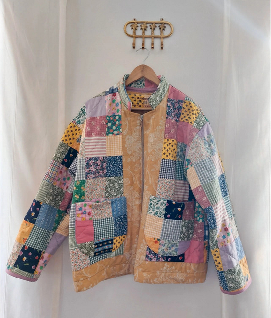 Unique patchwork coat, made out of a vintage quilt blanket. The coat has 2 pockets and closes with a zipper. It is a lovely piece to use as an in-between coat. The model is designed to wear a bit oversized.