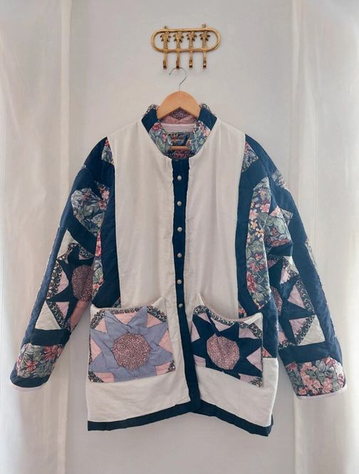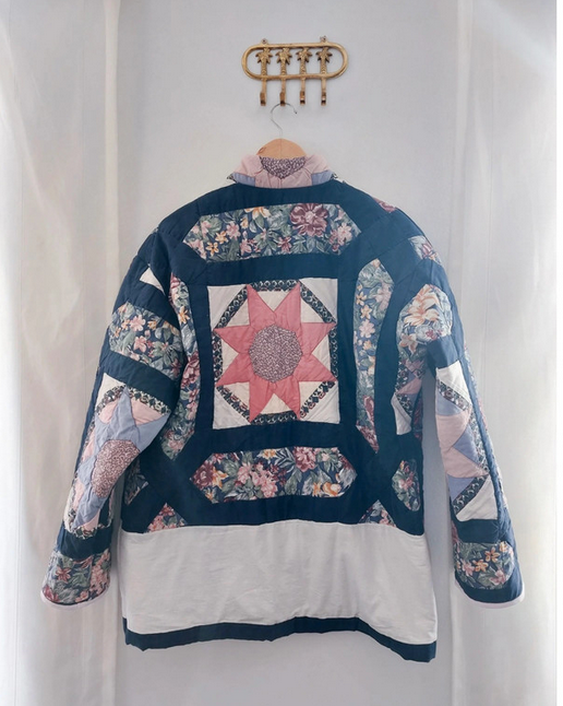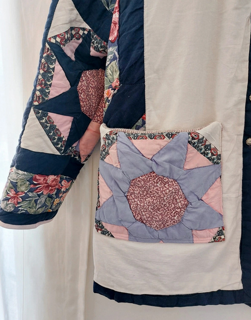 Unique patchwork coat, made out of a vintage quilt blanket. The coat has 2 pockets and closes with 6 small vintage buttons. It is a lovely piece to use as an in-between coat. The model is designed to wear a bit oversized.