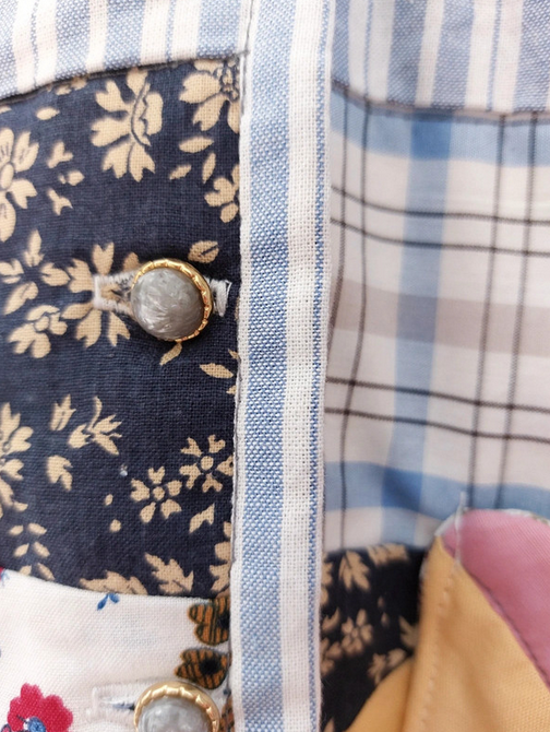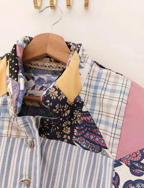 Unique patchwork coat, made out of a vintage quilt blanket. The coat has 2 pockets and closes with 6 small vintage buttons. It is a lovely piece to use as a summer jacket. The model is designed to wear a bit oversized. The quilt isn't padded but consist of two layers of cotton with an extra layer of terry cloth in between. Because of this, the jacket is pretty firm, feels nice and is perfect as a summer or in-between jacket.