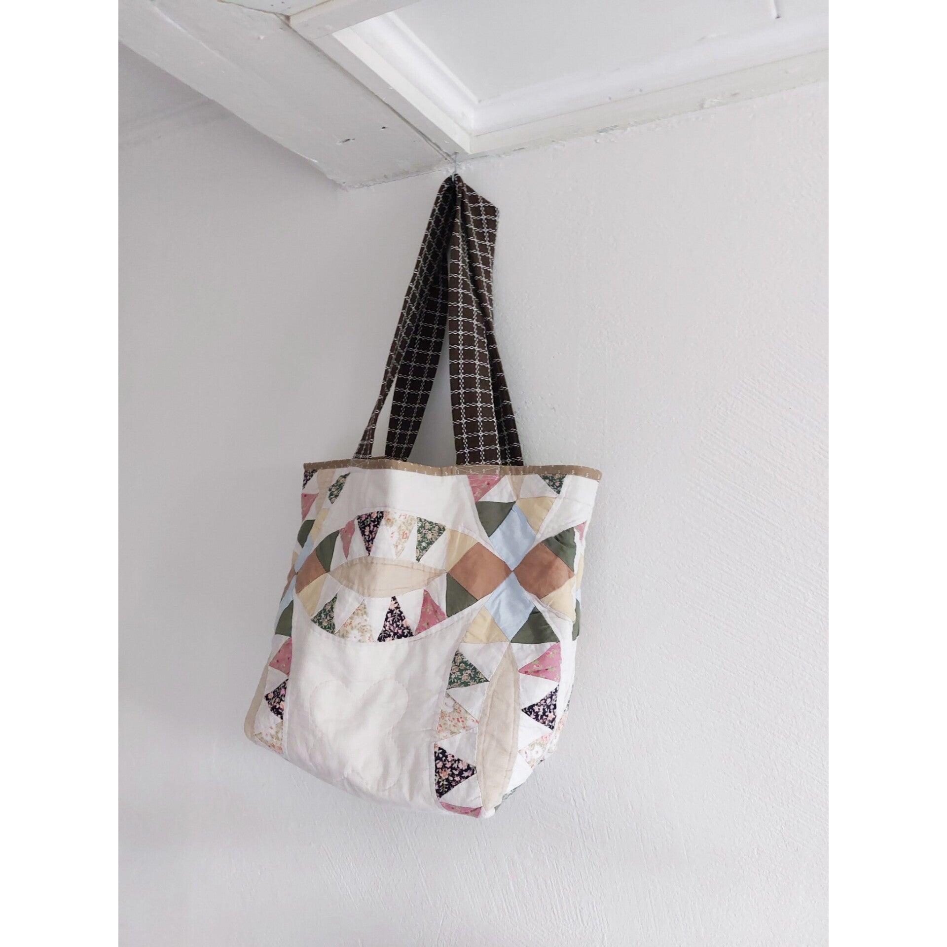Unique quilt shopper, made out of a patchwork blanket. The biais and straps are made from vintage pieces of fabric. This makes an unique shopper, eco-friendly and fairly made in the Netherlands. A few seems of the original quilt have repairs, see pictures.