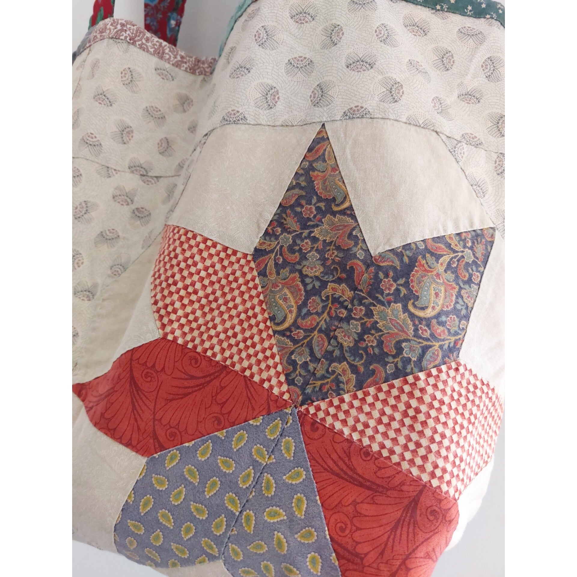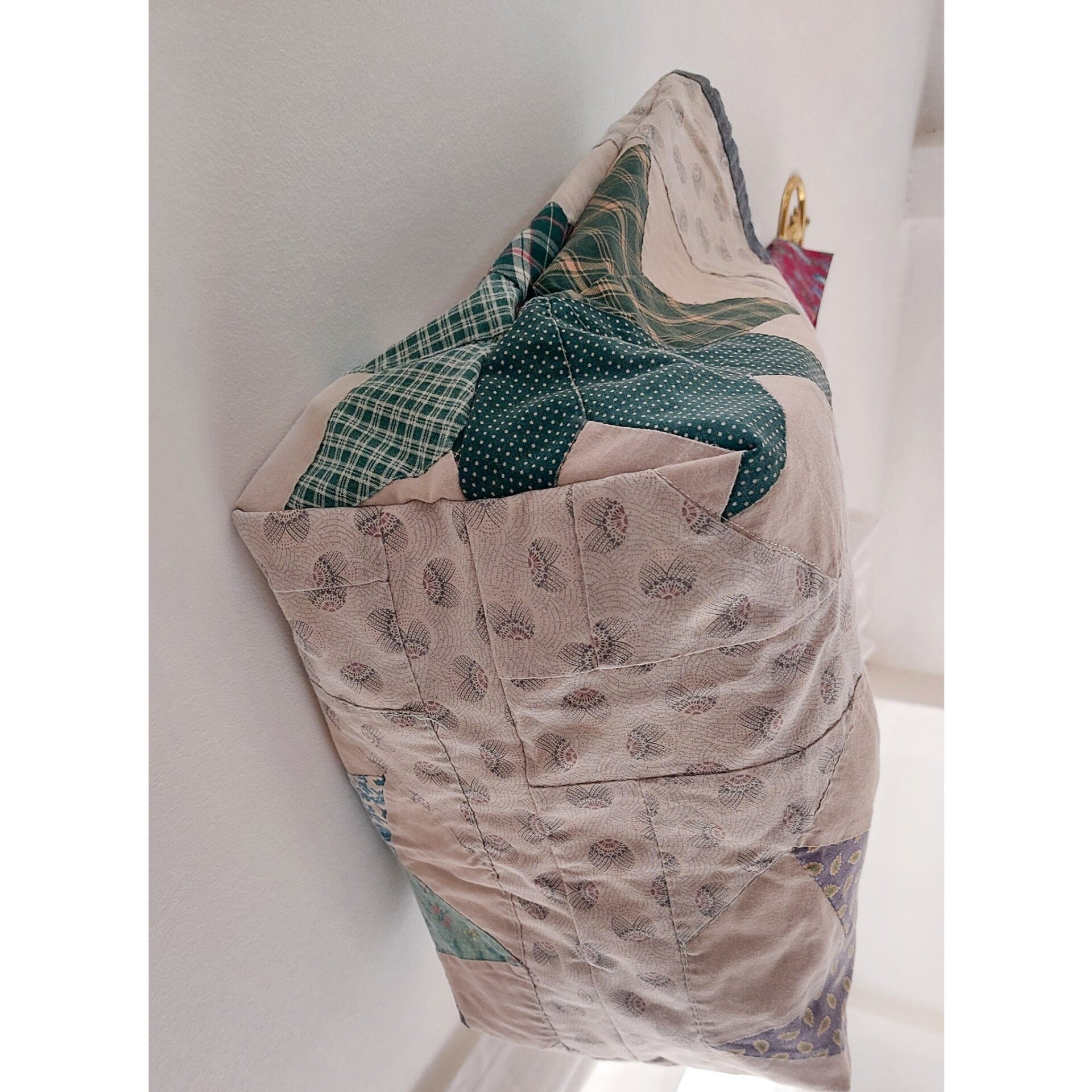 Unique quilt shopper, made out of a patchwork blanket. The biais and straps are made from vintage pieces of fabric. This bag is made from a fairly thin patchwork, without a fibre filling. This makes the bag a bit less firm but it makes it really easy to fold it and take it with you as an extra shopper when you go into town♡ It's an unique shopper, eco-friendly and fairly made in the Netherlands 🩷🪻