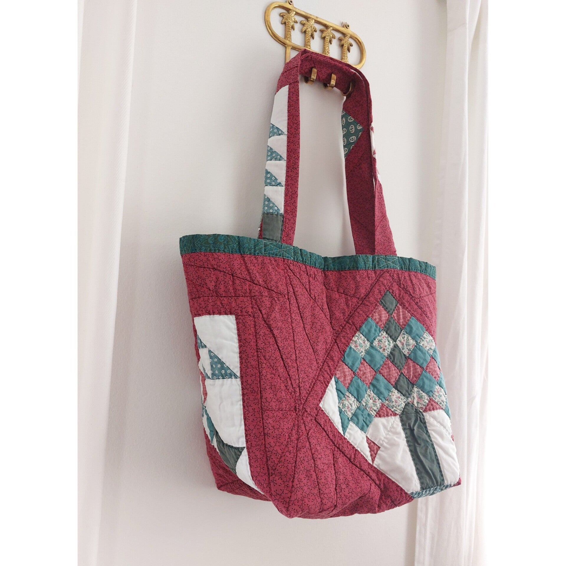 Unique quilt shopper, made out of a patchwork blanket. The biais and straps are made from vintage pieces of fabric. This makes an unique shopper, eco-friendly and fairly made in the Netherlands.