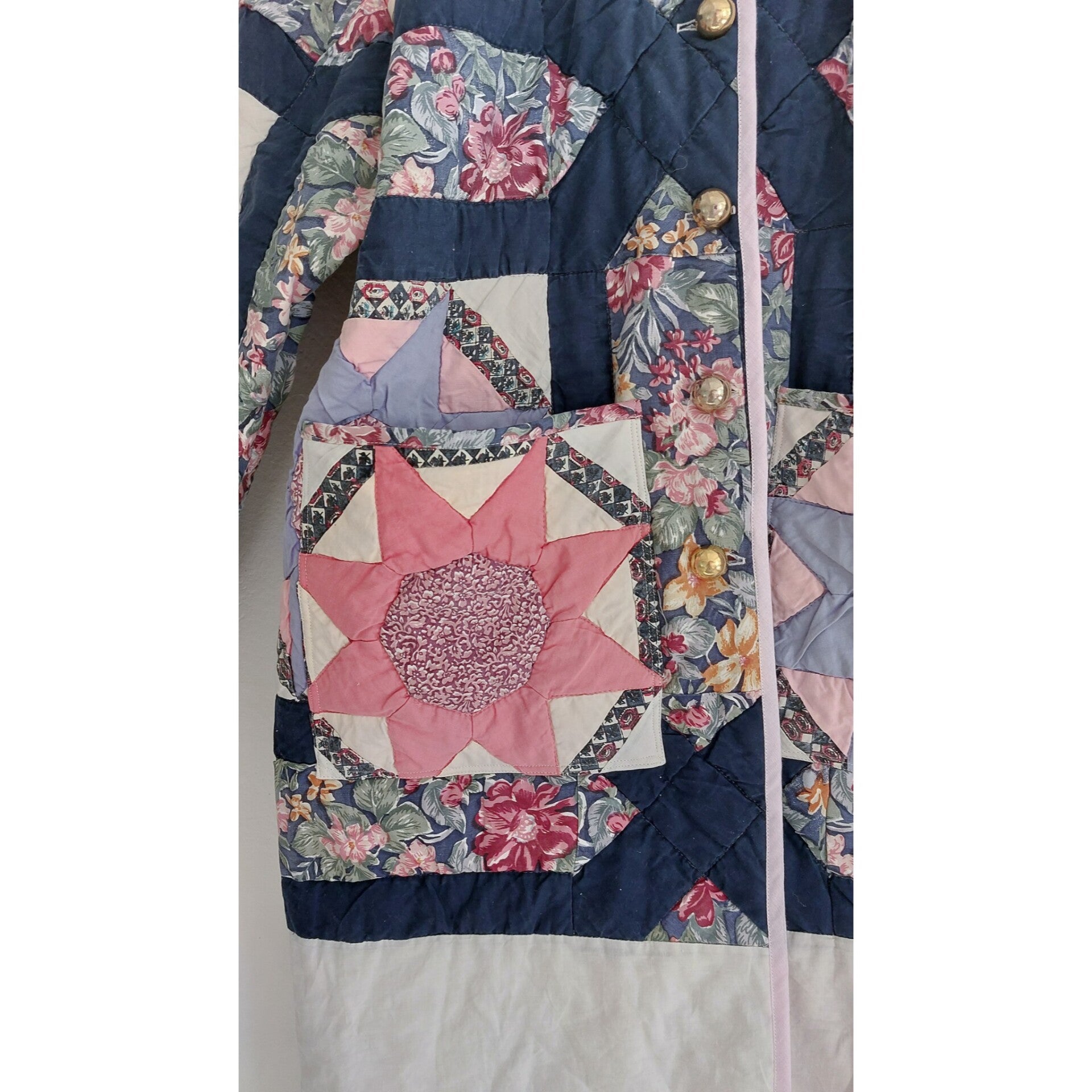 The fabric used to make the coat is real vintage, so there may be some signs of use. This one has no major flaws. All upcyclyed quilt pieces are just sustainable, vintage pieces of art.