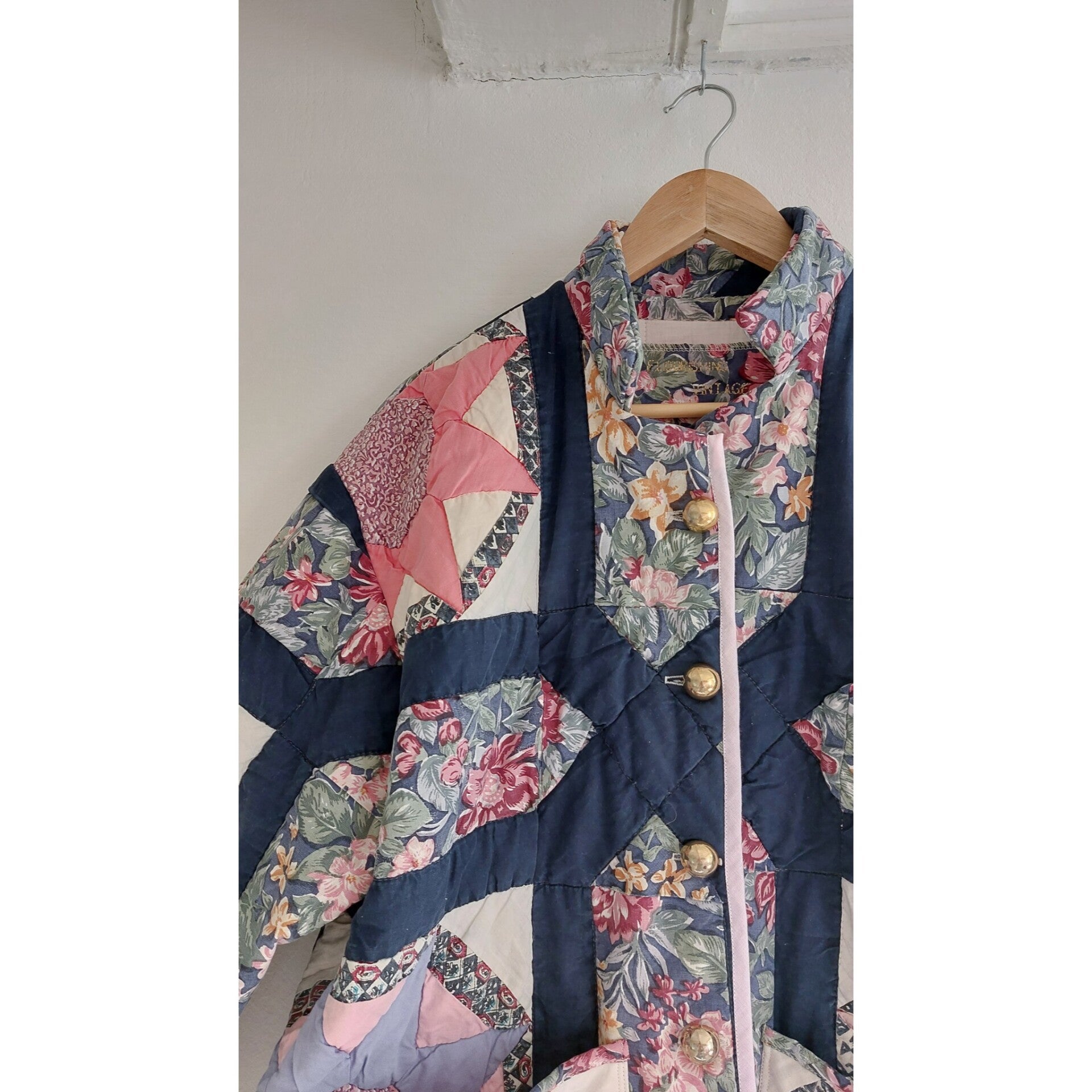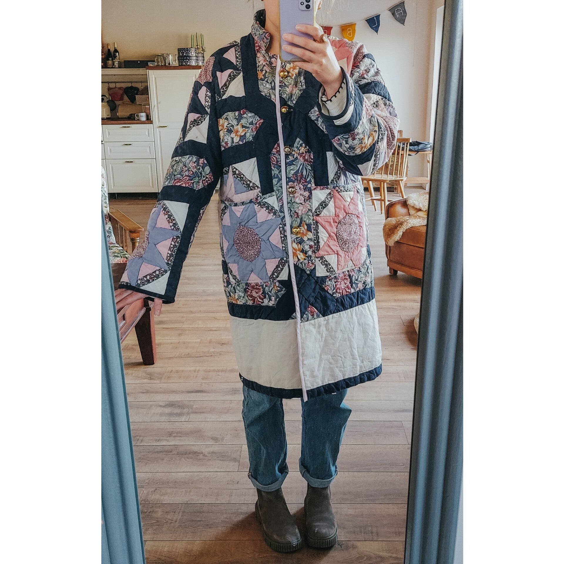 Uniqe patchwork coat, made out af a vintage, padded quilt blanket. It has 2 large pockets at front and closes with 5 large, vintage buttons.